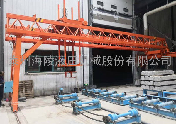 我公司設計制造的碼垛機由行走航架、升降裝置、自動夾緊定位裝置、減速機、電控系統(tǒng)等組成。設備整機為鋼結構件。行走航架通過行走電機驅動減速機帶動鋼軌輪旋轉,該電機帶剎車,可在任意位置剎車并停止行走。